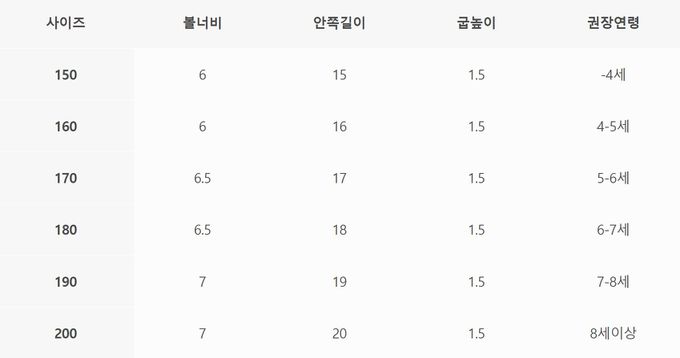 尺寸表由左至右為:尺寸、鞋寬、腳長、跟高、建議年齡