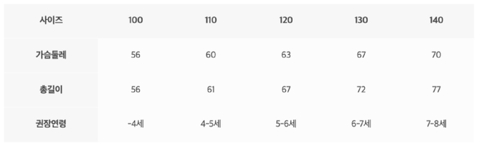 尺寸表由上而下為:尺寸、胸圍、總長、建議年齡