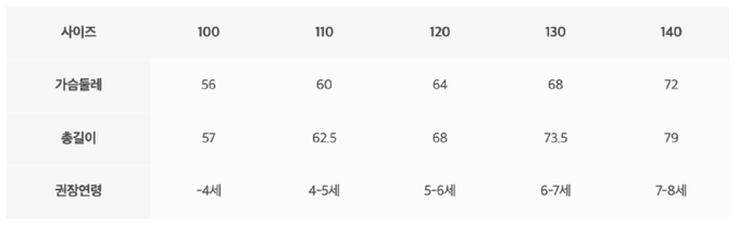尺寸表由上而下為:尺寸、胸圍、總長、建議年齡