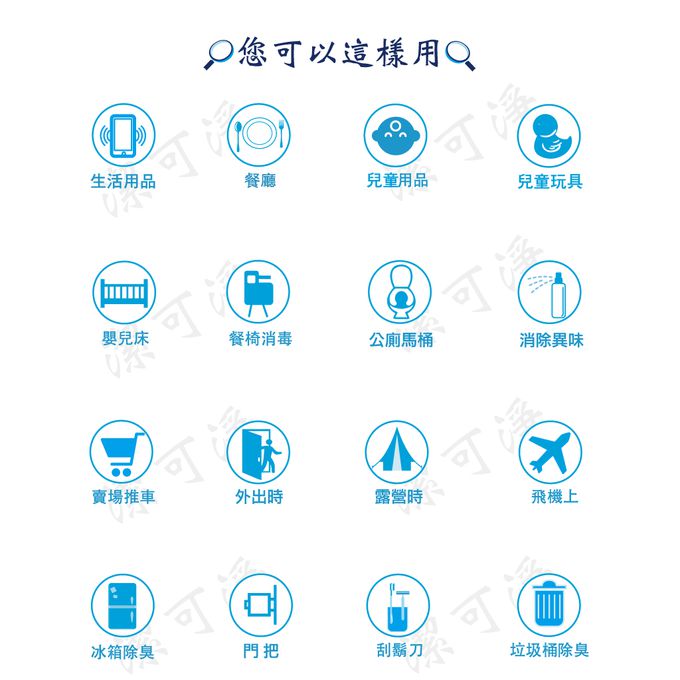 可用於清潔育嬰室、遊戲室、玩具、嬰兒背帶、嬰兒車、餐桌椅、尿布台、澡盆和汽車座椅等