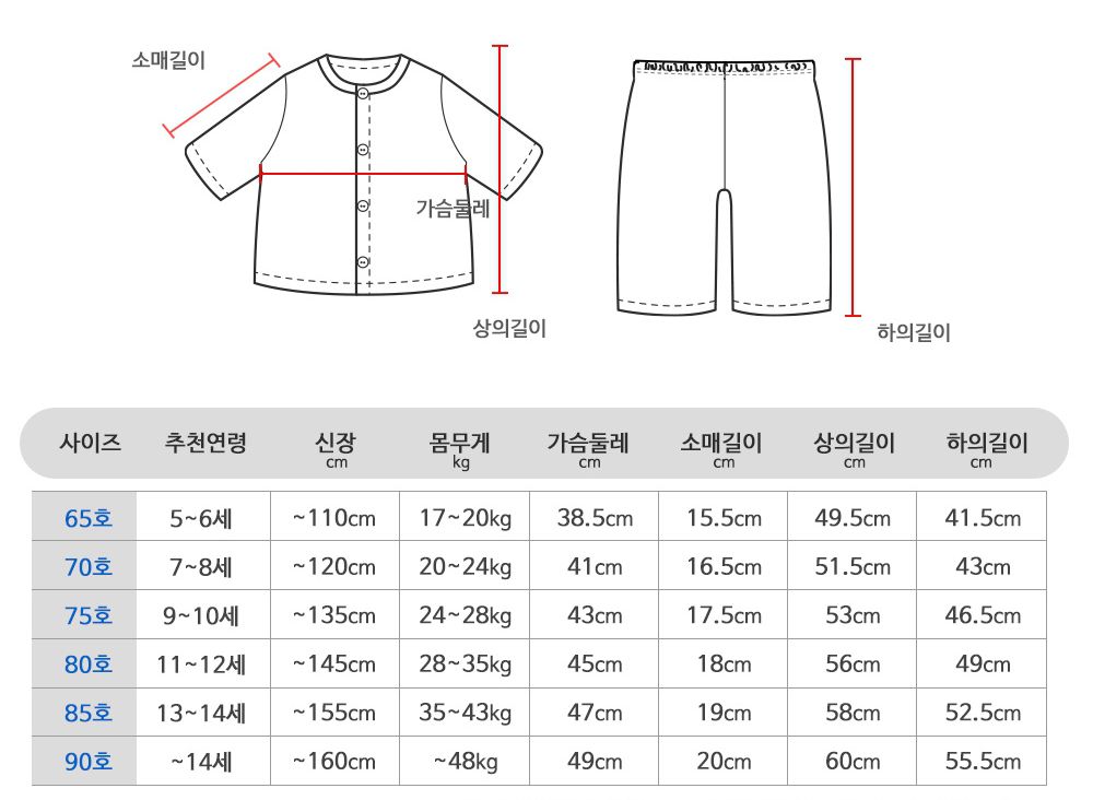 *尺寸表由左而右為:尺寸、建議年齡、身高、體重、胸圍、袖長、衣長、褲長
