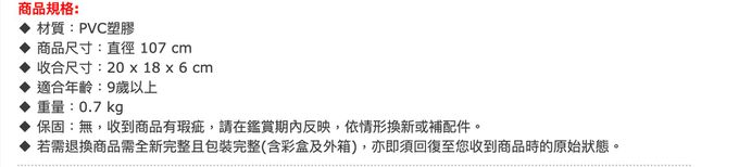 詳細尺寸:直徑 107 cm。 收合尺寸:20 x 18 x 6 cm