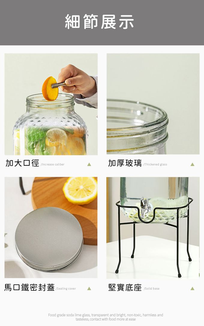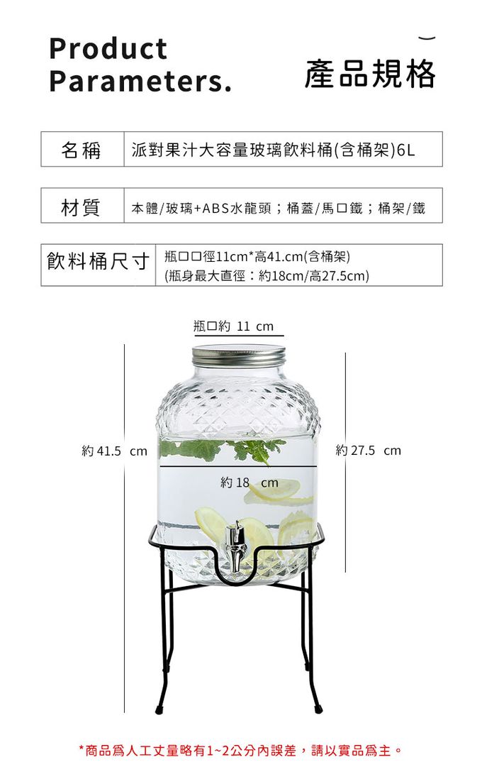 商品名稱:派對果汁大容量玻璃飲料桶(含桶架)6L