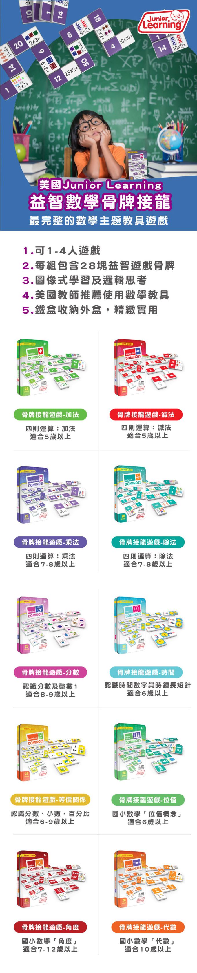 全系列以數學為發想,延伸出多種主題的骨牌接龍遊戲,非常適合拿來和孩子一起玩數學,且設計團隊皆是教育界的專家,所以邏輯非常清晰且容易理解,當作輔助孩子學數學的教具也完全沒問題👌🏻這次共有7款數學主題,除了基本的加➕減➖乘✖️除➗外,還有分數✔️等價關係✔️時間✔️