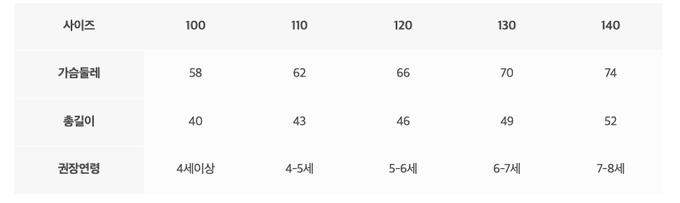 尺寸表由上而下為:尺寸、胸圍、總長、建議年齡