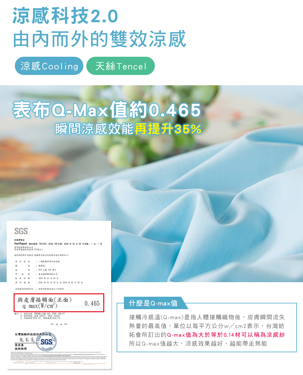 • 材質:表布-涼感紗(87%錦綸+13%氨綸)/填充物-30%天絲棉+70%聚酯纖維