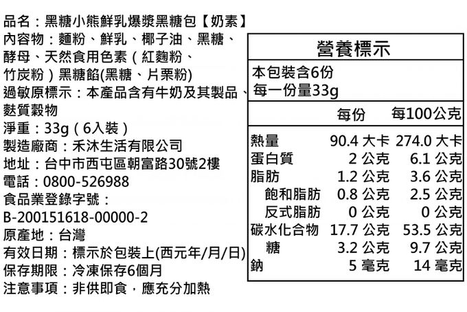 成分:麵粉、鮮乳、椰子油、黑糖、酵母、天然食用色素(竹炭粉、 紅麴粉)、黑糖餡(黑糖、片栗粉)