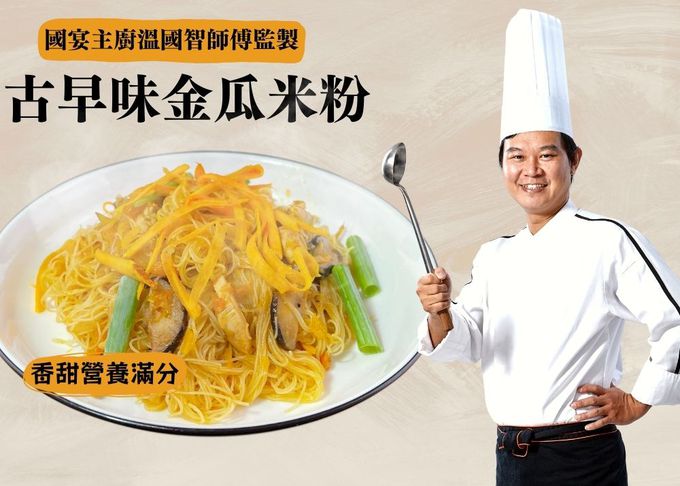 嚴選新鮮熟成南瓜,去皮去子後,蒸成南瓜泥,在將頭部的南瓜切成絲,所以這一道菜可以吃的到兩個南瓜口感,Q彈爽口的炊粉,再搭配香菇色澤豐富,做工複雜是餐廳版本的配方,而且非常好吃的金瓜炒米粉
