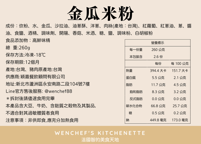 成分:炊粉、水、金瓜、沙拉油、油蔥酥、洋蔥、肉絲(產地:台灣)、紅蘿蔔、紅蔥油【葵花油(太陽花油)、紅蔥頭】、蔥、醬油【水、脫脂大豆(非基因改造)、食鹽、小麥、轉化液糖(蔗糖、水)、酒精、調味劑(胺基乙酸、5'-次黃嘌呤核苷酸二鈉、5'-鳥嘌呤核苷酸二鈉)】、開陽、香菇、米酒、糖、鹽、調味粉【調味劑(L-麩酸鈉、5'-次黃嘌呤核苷酸二鈉、琥珀酸二納)、食鹽、乳酪、砂糖、乾燻鰹魚、鰹魚抽出物、酵母抽出物、D-木糖、麥芽糖、葡萄糖、糊精】、白胡椒粉 食品添加物:高鮮味精【L-麩酸鈉、核苷酸(5'-次黃嘌呤核苷酸二鈉、5'-鳥嘌呤核苷酸二鈉)、羧甲基纖維素納】