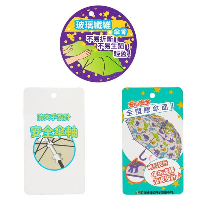 • 注意事項:●幼童在使用時請家長務必多加注意。●請勿當作拐杖等非雨傘本來的用途使用。請勿揮舞或亂丟。●把手或傘骨損壞時請勿使用,以免受傷或造成意外事故。●在有強風時使用或使用時太粗魯,都有可能造成破損或事故。●傘骨間有些地方較狹小,請小心不要夾到手或手指。●使用後請陰乾再收起來。以免造成生鏽或故障、損壞。●請勿放置在車內等高溫潮濕處,以免把手的材質等劣化而導致破損。●請注意,下大雨或長時間使用時,有可能會漏水。●本產品有些部分較尖銳,使用時請留意周圍的安全。●使用時或開闔時,請探頭留意周圍的安全再使用。●傘骨的材質為玻璃纖維強化塑膠。傘骨彎折或表面起毛邊,有可能會讓玻璃纖維的前端露出來,請勿用手觸碰。若被玻璃纖維刺到,且皮膚持續疼痛時,請立即就醫。