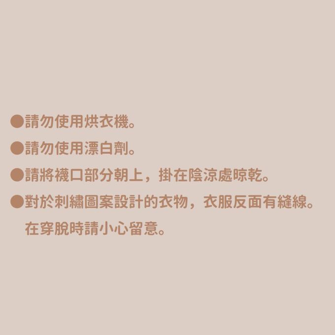 注意事項:●標示內容遵照台灣法規之規定。●請將襪口朝上,在陰涼處晾乾。●有編織圖案的款式,其紗線會一起編織到布料內側,因此在穿脫時需小心。