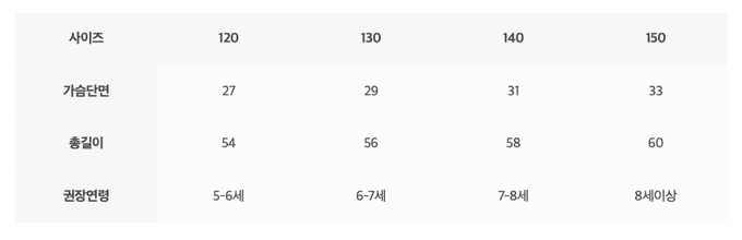 尺寸表由左至右為:尺寸、胸寬、衣長、建議年齡
