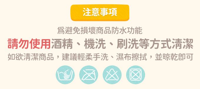 注意事項:為避免損壞商品防水功能,請勿使用酒精、機洗、刷洗等方式清潔。如欲清潔商品,建議輕柔手洗或濕布擦拭、晾乾即可。