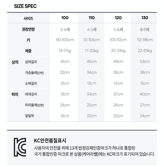 尺寸表由上而下為:尺寸/建議年齡、身高、體重/上衣:衣長、胸寬、袖長/下著:褲長、腰寬、下擺寬