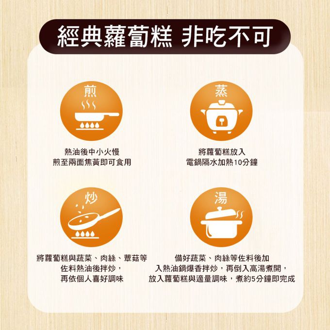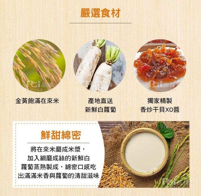 成分:水、白蘿蔔、在來米、玉米澱粉、無辣 XO 醬{大豆沙拉油、干貝、金華火腿[豬肉(加拿大、台灣)、鹽]、金勾蝦米、紅蔥頭、蒜頭、香油(大豆沙拉油、芝麻油)、冰糖}、大豆沙拉油、豬肉(台灣)、蝦米、鹽、L-麩酸鈉(調味劑)、糖