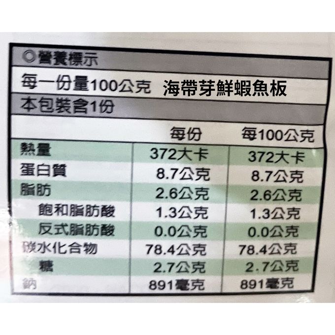成分:粳白米、紅蘿蔔、海帶芽、玉米粒、菠菜丁、青蔥、魚板、蝦仁、海藻糖、食鹽、調味劑(柴魚粉(L-麩胺酸鈉、琥珀酸二鈉、麥芽糊精、蔗糖、5-次黃嘌呤核甘磷酸二鈉、胡椒、5-鳥嘌呤核甘磷酸二鈉、柴魚抽出物、昆布抽出物、胺基乙酸、DL-胺基丙酸、乳糖、甘草酸胺(甜味劑)甘草素(甜味劑))、洋蔥粉、椰子油粉末)