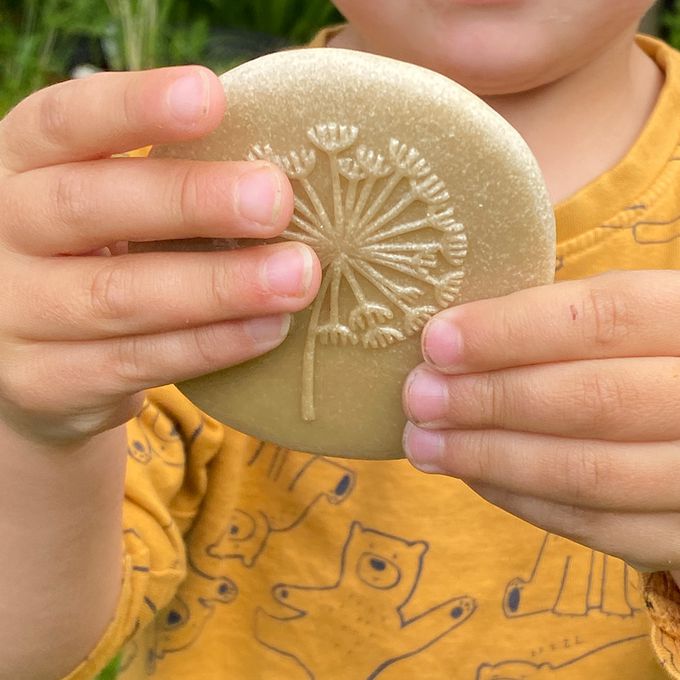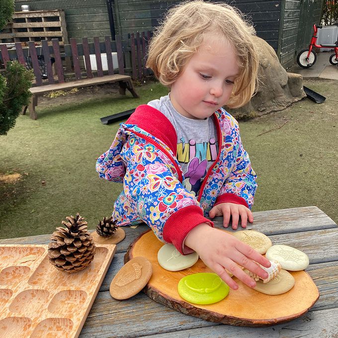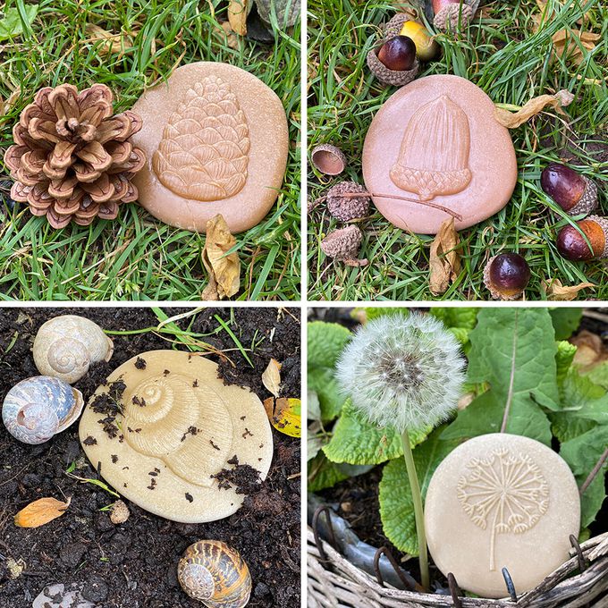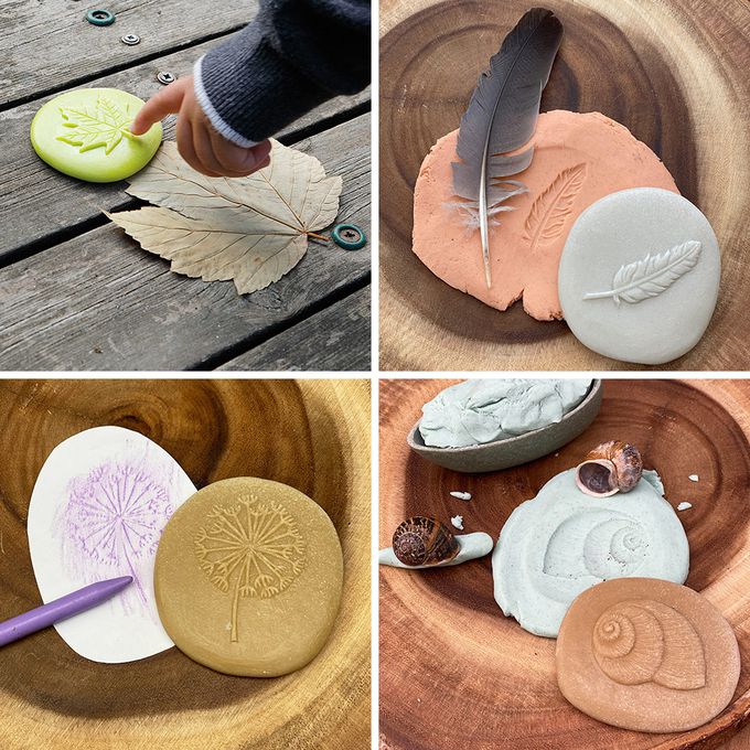 在黏土上蓋印章、或用蠟筆拓印畫,厚實的石頭重量讓圖案呈現更清楚。