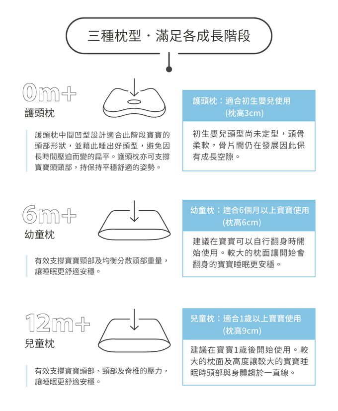 注意事項:使用嬰兒枕時讓嬰兒採仰睡,避免趴睡或側睡,以免發生窒息危險 請在成人看顧下使用本產品