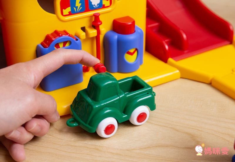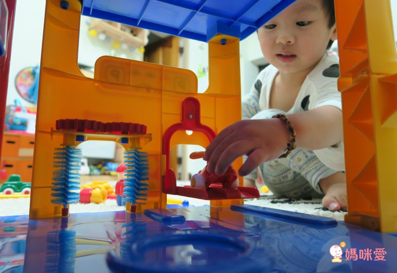2.擬真洗車場:這洗車場真的很特別!是我沒在其他玩具品牌看過的設計!外觀有兩個齒輪,當孩子用手去轉動齒輪,就可以控制內部左右兩側的洗車刷,邊刷小車還會邊自動往前進!就跟真的洗車場一模一樣!光是這個機關,孩子就可以一台接著一台洗車,玩上一上午~