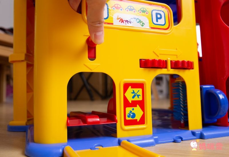 5.起降機:洗車場旁邊有個可以上下滑動的小手把,是用來控制裡面的起降機,把車車放上去就可以模擬電動停車場,把車子送到上一層停妥囉!