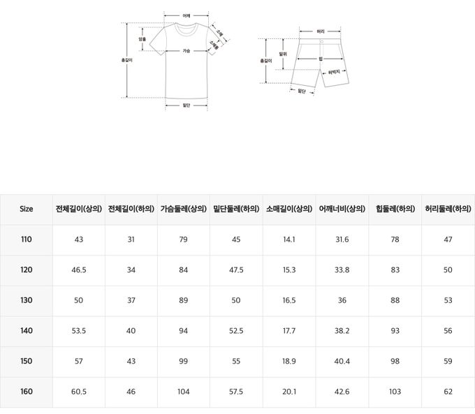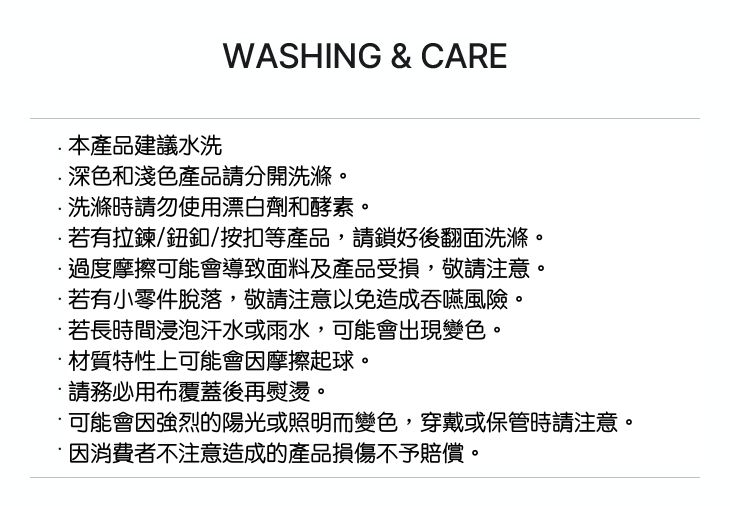 *尺寸表由左至右為:衣長、褲長、胸圍、褲管圍、袖長、肩寬、臀圍、腰圍