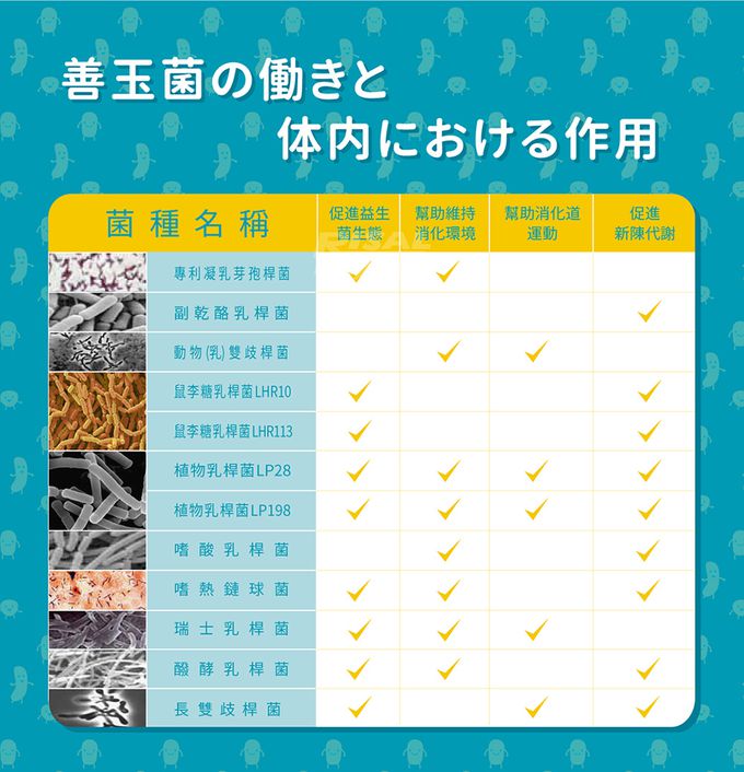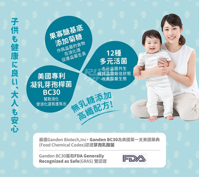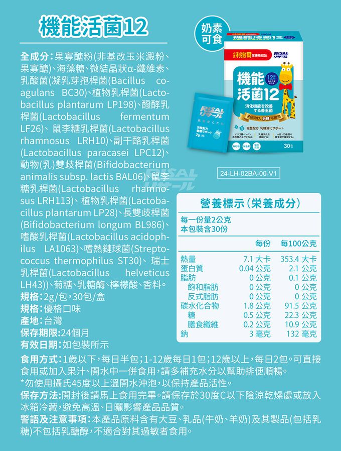 成分:果寡醣粉(非基改玉米澱粉、果寡醣)、山梨醇(甜味劑)、微結晶狀α-纖維素、乳酸菌(植物乳桿菌LP198、凝乳芽孢桿菌BC30、植物乳桿菌LP28、鼠李糖乳桿菌LRH113、長雙歧桿菌BL986、動物(乳)雙歧桿菌BAL06、嗜酸乳桿菌 LA1063、醱酵乳桿菌LF26、鼠李糖乳桿菌LRH10、副乾酪乳桿菌LPC12、瑞士乳桿菌LH43、嗜熱鏈球菌ST30)、菊糖、乳糖酶、蘋果酸、香料