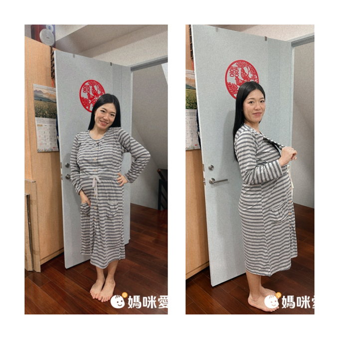 橫紋長袖洋裝,胸口位置有哺乳口,親餵的時候很方便