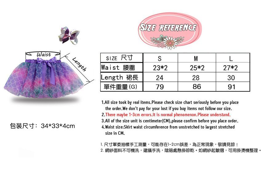 ~溫馨提醒~:裙子是以一片一片的網紗組成,並非一體式短裙,請媽咪搭配內搭褲/安全褲使用。為了安全考量,腰間的蝴蝶結綁帶會請廠商去除,避免孩子穿著在活動時勾住絆倒發生危險。詳細商品資訊請參考下方圖示噢!