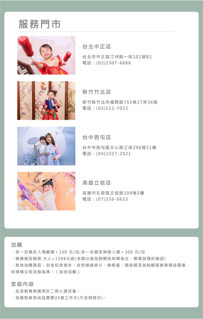 0. 如專案包含妝髮服務,或是欲加購妝髮的媽咪,請致電先與門市確認造型師的時段、再進行報名喔!