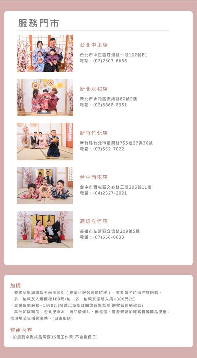 1. 抓周:專案人數皆為兩大一小,如為雙胞胎,則須加購「兩組套裝」,抓周方案雙胞胎可預約時段有限,詳情請洽各分店門市諮詢。