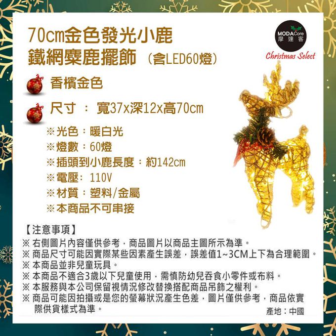品名:70CM金色發光小鹿-鐵網麋鹿擺飾含LED60燈(暖白光)