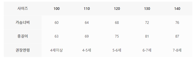 尺寸表由上而下為:尺寸、胸圍、總長、建議年齡