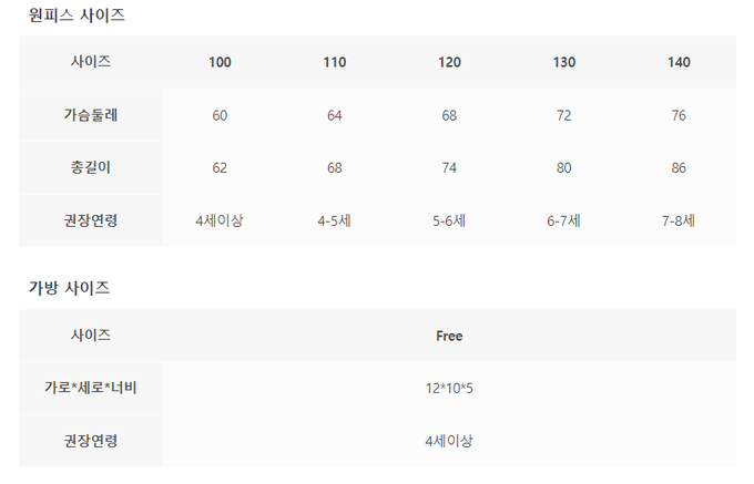 洋裝尺寸表由上而下為:尺寸、胸圍、總長、建議年齡