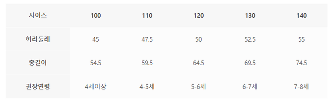 尺寸表由上而下為:尺寸、腰圍、總長、建議年齡