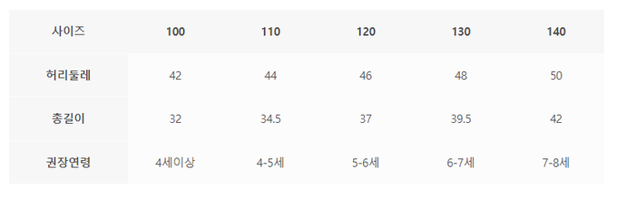 尺寸表由上而下為:尺寸、腰圍、總長、建議年齡