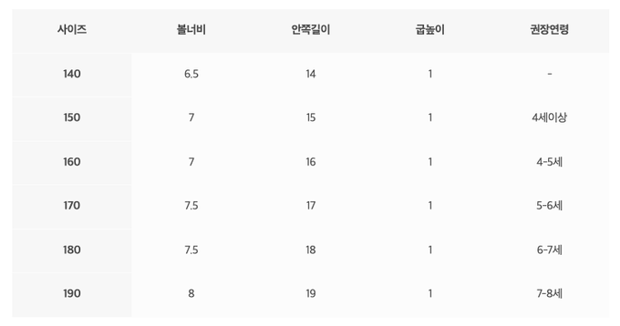 尺寸表由左至右為:尺寸、鞋寬、腳長、跟高、建議年齡