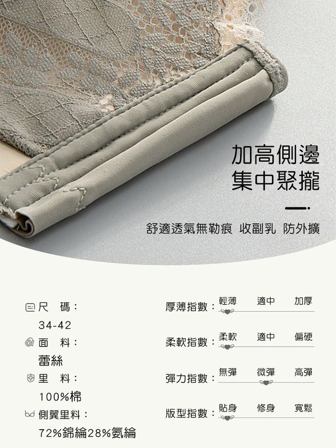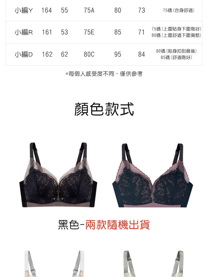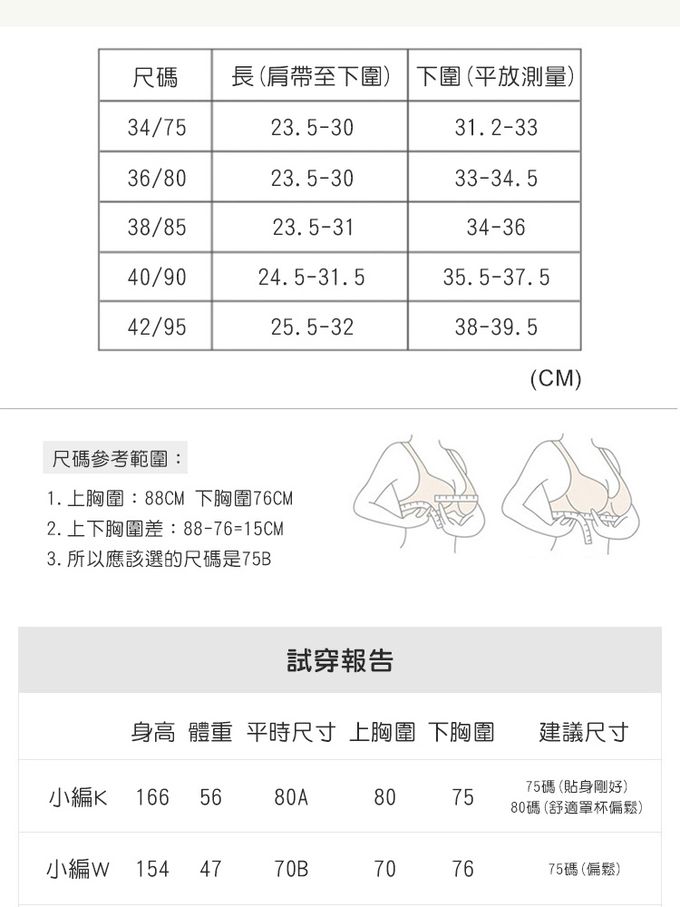 【商品尺寸】34/75、36/80、38/85、40/90、42/95(罩杯均碼落在C-D左右)