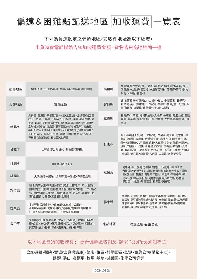1.部分地區為貨運認定需加收運費之區域,下單後客服會電話聯絡告知加收金額,詳細資訊請參考加收運費一覽表