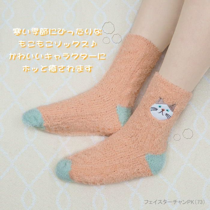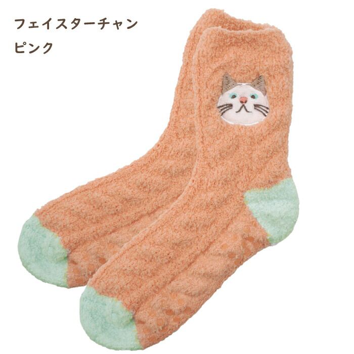 日本 friendshill - 可愛刺繡柔軟針織保暖室內襪-貓咪-橘粉 (22-25cm)