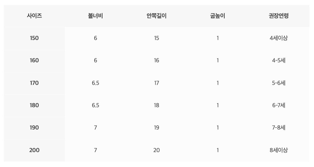 尺寸表由左至右為:尺寸、鞋寬、腳長、跟高、建議年齡