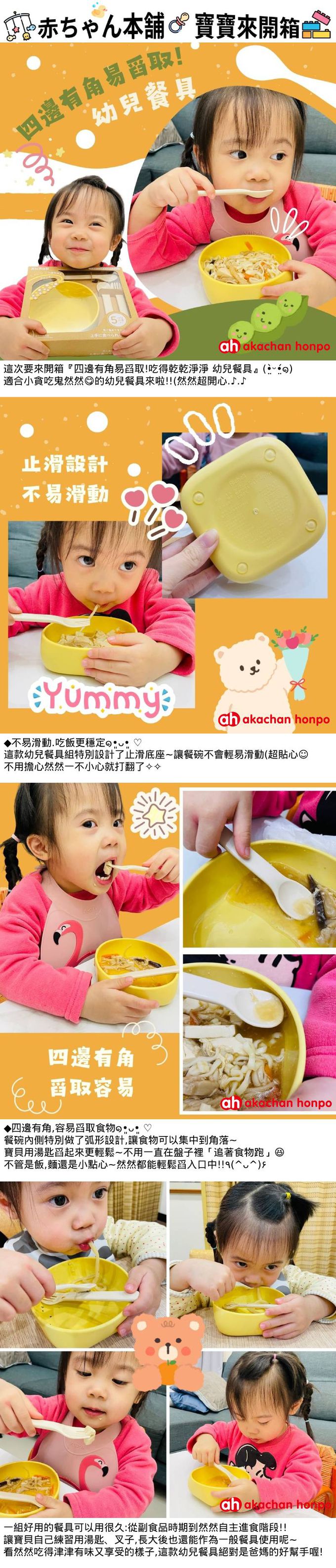 不易滑動的幼兒餐具3件組。內側的弧形設計方便將食物集中到角落,且不易讓食物滑落。下面有止滑設計,即使只擺放餐具也不易滑動。能解決幼童吃副食品時所產生的困擾,充滿各種功能的餐具。初期可用好握湯匙及餐具,中期之後可當作手拿餐盤、練習吃飯用的湯匙及叉子使用,好舀取、不易滑。小寶寶可以自己吃飯後也很實用。