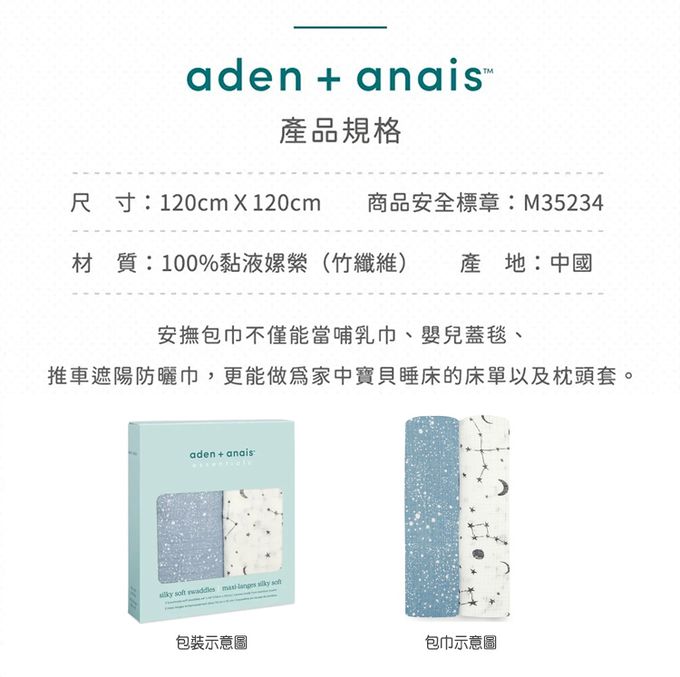 【產品特點】●100%竹纖維紗布棉,採用由竹纖維萃取出的人造絲所製成,相較一般純棉製品具更佳的抗紫外線功效●採用Muslin 100%細紗布棉,運用開放的稀鬆編織法,減少嬰兒過熱窒息的風險●Muslin 棉為一種耐用的材質,能夠承受手洗及機洗清理,並隨著使用時間增長而變得更柔軟●Muslin 棉細緻、柔軟耐用且延展性佳,可以帶給寶貝安撫的效果,感受在媽媽懷抱中舒適的安心感●一巾多用,包巾不僅能當哺乳巾也能作為嬰兒蓋毯以及推車遮陽巾,更可以當作居家的床單以及枕頭套,多種用途超方便