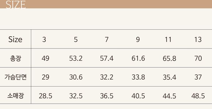 尺寸表由上而下為:總長、胸寬、袖長。