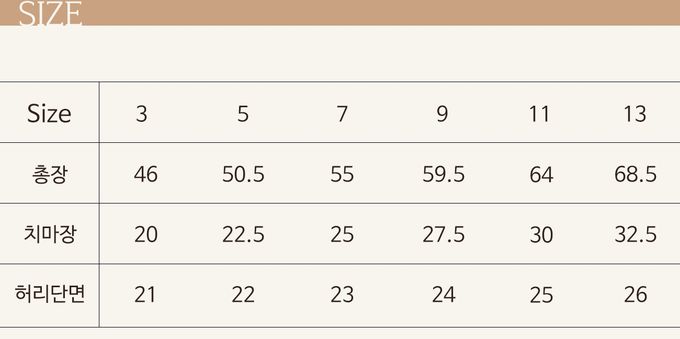 尺寸表由上而下為:總長、裙長、腰寬。