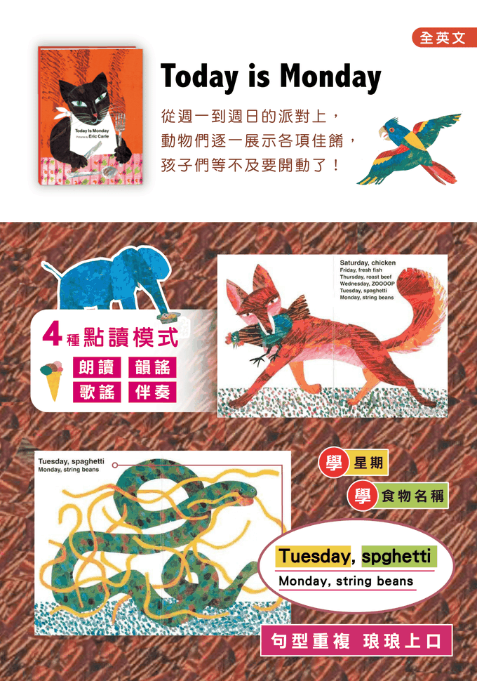 這本與另外兩本作品《毛毛蟲》《棕熊》不同之處在於,它最後一頁還有樂譜跟歌詞!可能是因為《Today Is Monday》相較其它2本節奏最洗腦的~聽完後整首歌在腦海中揮之不去!