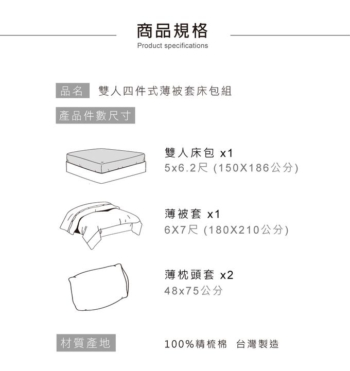 內容物:床包 1件+薄被套 1件+ 薄枕頭套 2件