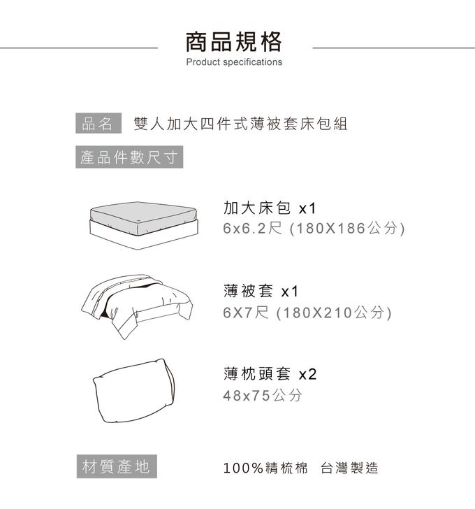 內容物:床包 1件+薄被套 1件+ 薄枕頭套 2件