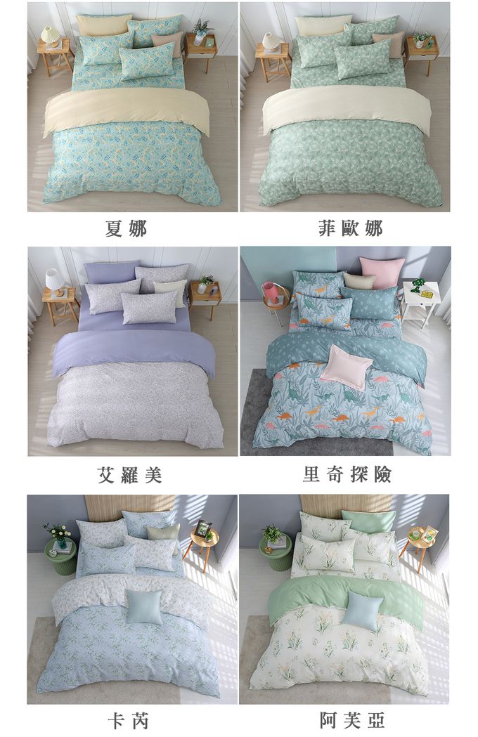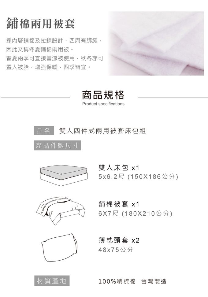 內容物:床包 1件+兩用被套 1件+ 薄枕頭套 2件