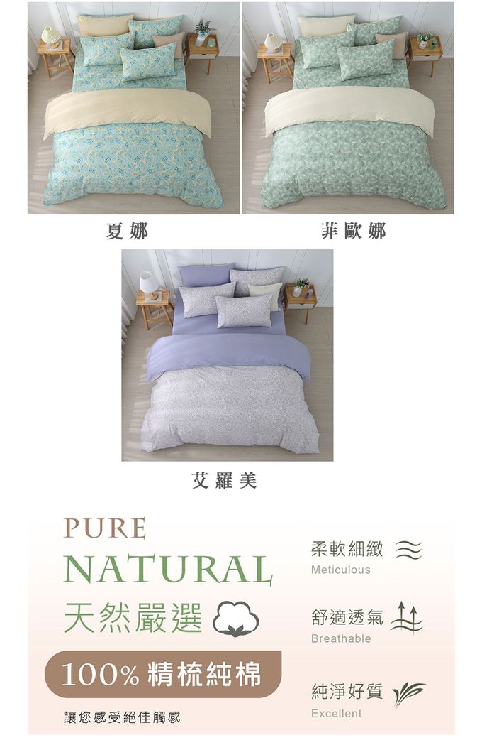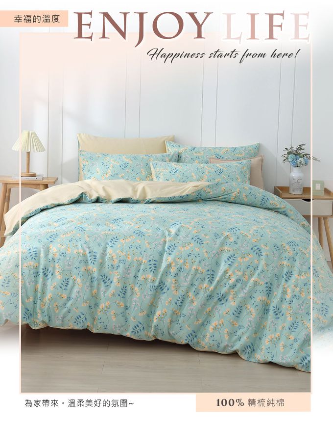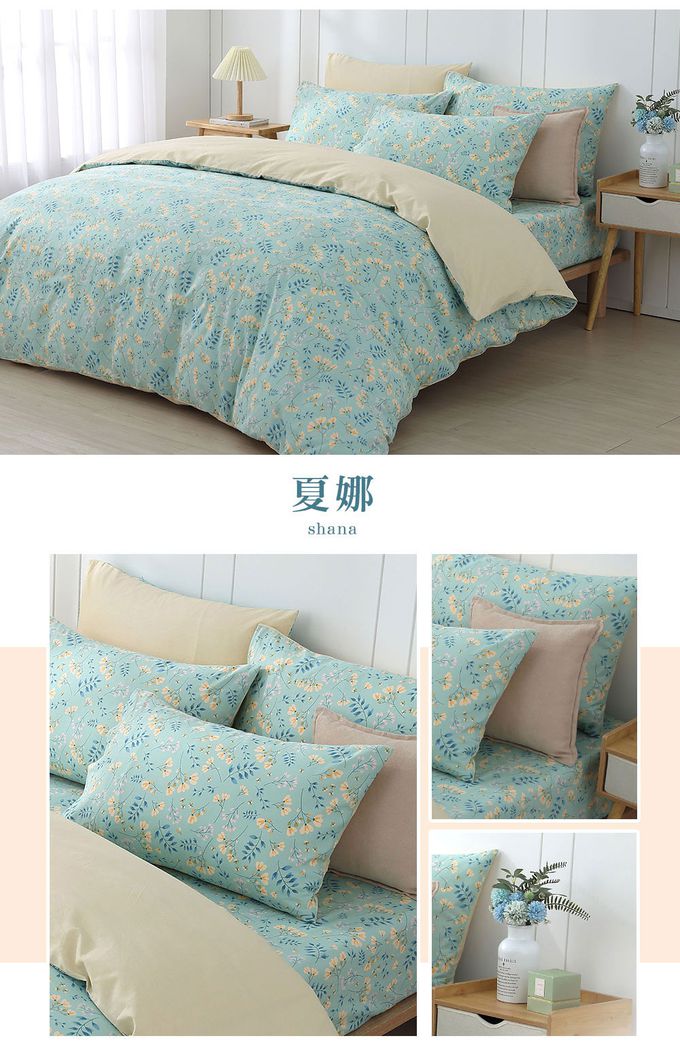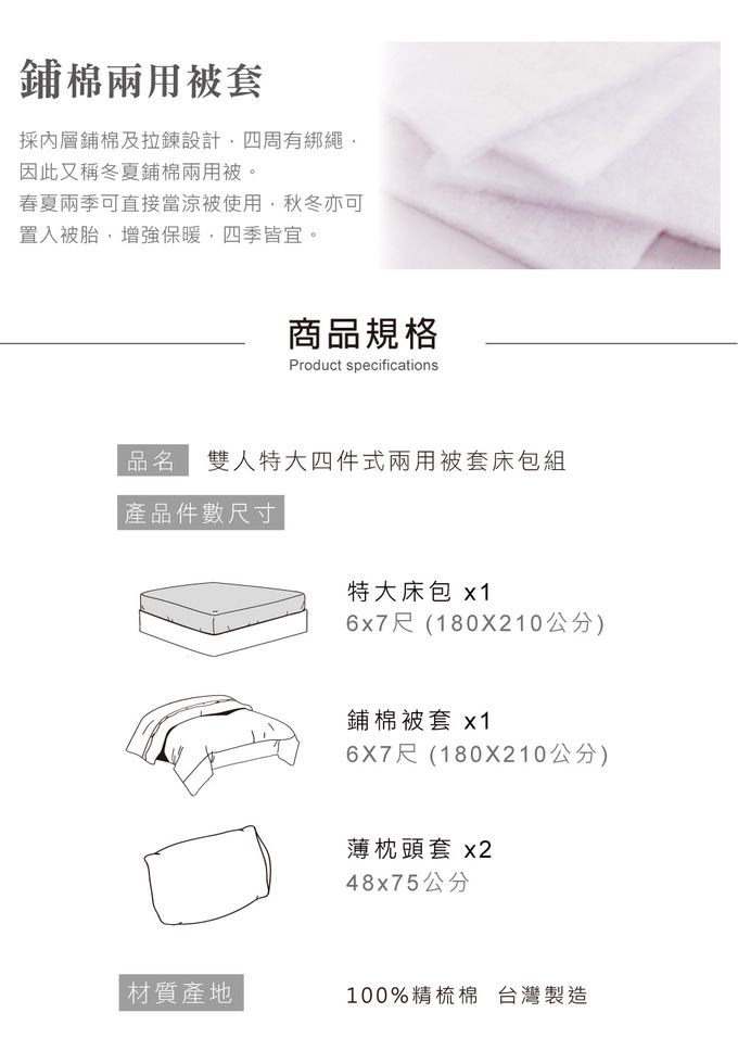 內容物:床包 1件+兩用被套 1件+ 薄枕頭套 2件