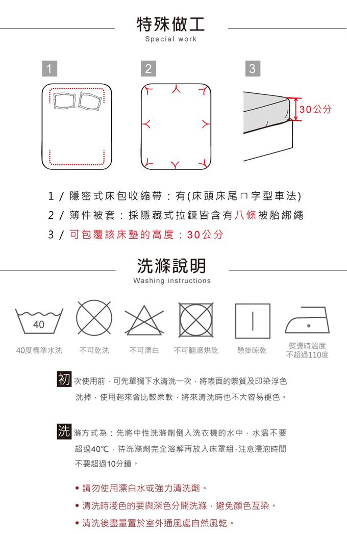 可水洗/不可乾洗/不可漂白/不可烘乾/可蒸氣熨燙